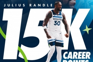 森林狼官方發推,祝賀蘭德爾達成15000分里程碑。