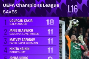 本屆歐冠1/8決賽撲救次數(shù)榜: