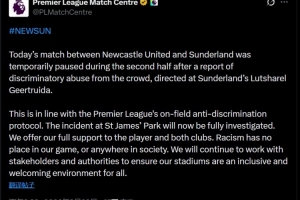 “此舉符合英超聯賽的場上反歧視協議。圣詹姆斯公園球場發生的這起事件現在將接受全面調查。我們向該球員及兩家俱樂部提供全力支持。種族主義在我們的比賽中、或社會任何角落都絕無立足之地。我們將繼續與各利益相關方及當局合作,確保我們的球場成為一個對所有人極具包容性且受歡迎的環境。”