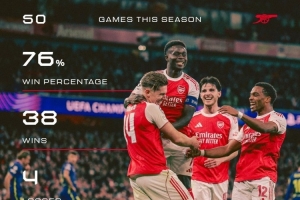 阿森納本賽季至今參加50場比賽,戰績38勝8平4負,勝率高達76%。