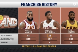 據統計,這是米切爾本賽季第6場40+,騎士生涯第25場,隊史第二,僅次于詹姆斯的51場。