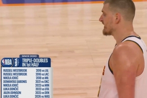 此役上半場,約基奇拿到15分11籃板9助攻的數據,差1次助攻錯失半場三雙。