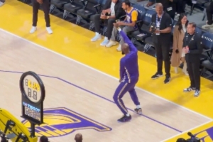 賽前熱身環節,詹姆斯大秀曼妙舞姿,隨后溜底線空接助飛海斯。