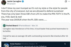 緊接著球迷Parted Beard發(fā)文反駁Heaton:“卡拉格就是他那個(gè)時(shí)代的亨德森。一個(gè)嗓門大的領(lǐng)袖,會(huì)推著隊(duì)友變得更好。但總體來說他只是個(gè)平庸的中衛(wèi),高光時(shí)刻只有伊斯坦布爾之夜半場后的大逆轉(zhuǎn)……”