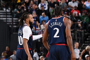記者提到當加蘭和倫納德同時在場時,球隊84%的出手都集中在籃下或者三分線外,對此可以說:“我非常喜歡這個組合,加蘭能能夠打擋拆,突破到內線并做出正確的選擇,科懷(倫納德)一旦上場就能吸引大量的防守注意力。”