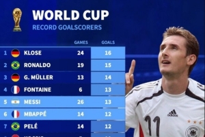 世界杯歷史射手榜:克洛澤、大羅前二,梅西第五姆巴佩第六