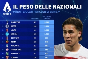 體育資訊4月2日訊 德國(guó)轉(zhuǎn)會(huì)市場(chǎng)統(tǒng)計(jì)了意甲各隊(duì)球員在這個(gè)國(guó)際比賽日的出場(chǎng)總時(shí)間,并列出榜單,尤文、國(guó)米、米蘭前三。