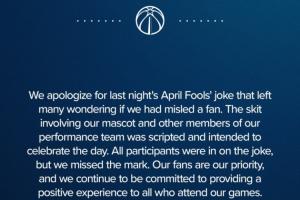 體育資訊04月03日訊 奇才官方今日發布聲明,表示為愚人節惡作劇向球迷道歉。