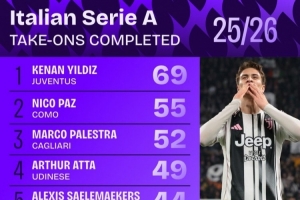 體育資訊4月3日訊 Squawka列出了本賽季意甲成功過(guò)人排名,伊爾迪茲69次居首,尼科·帕斯55次第二。