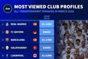 體育資訊4月3日訊 德國轉會市場統計了3月份俱樂部頁面的瀏覽量,并列出榜單,皇馬居首,巴薩、拜仁排名二三位。