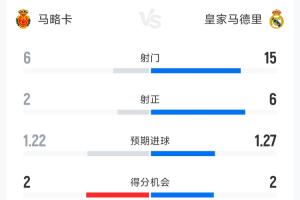 體育資訊4月5日訊 西甲第30輪馬略卡2-1皇家馬德里,以下為雙方全場數據對比: