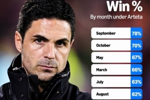阿爾特塔執教阿森納各個月份勝率(勝率從高到低排序):