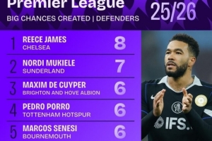 體育資訊4月6日訊 squawka統(tǒng)計(jì)了本賽季英超后衛(wèi)的創(chuàng)造重大機(jī)會(huì)情況,藍(lán)軍隊(duì)長(zhǎng)里斯·詹姆斯領(lǐng)跑。