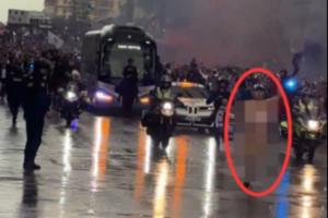 據(jù)TA記者Guillermo Rai在現(xiàn)場(chǎng)的拍攝,皇馬大巴在球迷的簇?fù)碇星巴{烏球場(chǎng),而大巴前還跑過(guò)一名裸男。