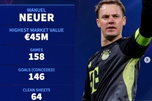 德轉也列出了諾伊爾(巔峰身價4500萬歐元)歐冠生涯關鍵數據:出戰158場,丟146球,完成64次零封,平均每93分鐘丟1球。