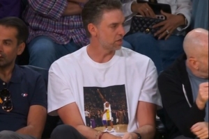 湖人名宿大加索爾來到現場觀戰,身上穿著一件印有科比81分慶祝動作的T恤。