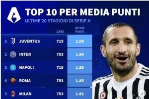 體育資訊4月9日訊 德國轉(zhuǎn)會市場統(tǒng)計了過去20個賽季意甲球隊的聯(lián)賽場均積分,以及總積分,并列出榜單。