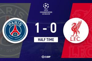 半場-巴黎暫1-0利物浦 杜埃兜射破門利物浦半場僅1次射門0射正