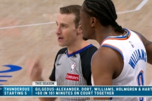 比賽中轉播方曬出一組數據:本賽季雷霆擺出亞歷山大+多特+杰倫威+霍姆格倫+哈滕的首發組合一共只打了101分鐘,期間正負值高達+60!