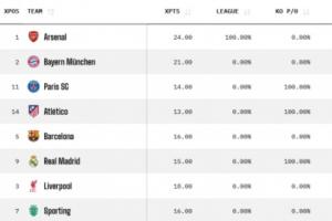 體育資訊04月09日訊 歐冠1/4決賽首回合較量全部結(jié)束,巴薩0-2馬競,巴黎2-0利物浦,皇馬1-2拜仁,葡體0-1阿森納。Opta超算更新了最新的歐冠奪冠概率。