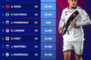 德轉自由球員身價榜:庫蒂尼奧250萬歐第3,阿里僅剩100萬歐第10