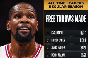 截至發稿時,火箭球星杜蘭特罰球4中4,生涯常規賽罰球命中數來到7695個,超越“大O”奧斯卡·羅伯特森(7694個)升至歷史第六,前面一位是科比(8378個)。