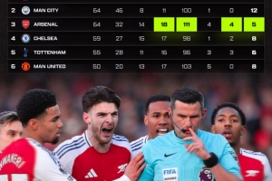 博主:奧利弗執(zhí)法阿森納和曼城均為64場(chǎng),但從未向后者出示紅牌