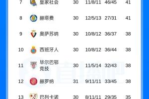 還剩7輪!西甲積分榜:皇馬先賽距榜首6分,巴薩將戰(zhàn)西班牙人