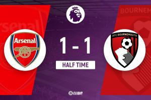 上半場補時2分鐘。半場戰罷,阿森納1-1伯恩茅斯。
