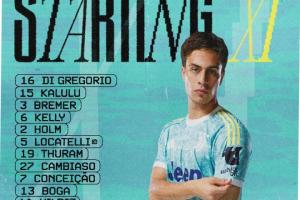 尤文首發:16-迪格雷戈里奧、15-卡盧盧、3-布雷默、6-凱利、2-霍爾姆、5-洛卡特利、19-K·圖拉姆、27-坎比亞索、7-孔塞桑、13-博加、10-伊爾迪茲