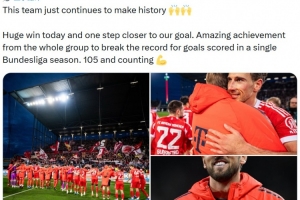 他也在賽后通過社媒曬出比賽照,并慶祝勝利:“這支球隊仍在創造歷史????今天取得重大勝利,離我們的目標又近了一步。全隊共同努力取得非凡成就,打破了德甲單賽季進球紀錄。目前已經105球了,而且還在繼續增加!”