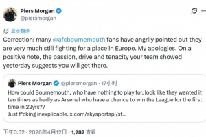 英國名嘴、阿森納球迷摩根在社媒痛批槍手的表現,他表示無欲無求的伯恩茅斯比爭冠的阿森納展現出了更強烈的求勝欲望。