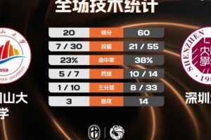 末節決戰,井岡山大學依然半節多時間內一分未得,李魯粵連續籃下取分幫助深圳大學領先到40分以上。楊涵銀造殺傷終于止血,但孫琦越三分再命中回應,時間所剩無幾,最終深圳大學60-20大勝井岡山大學。