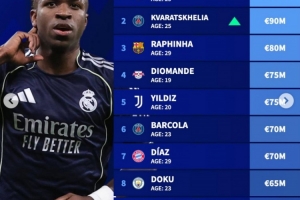 德轉左邊鋒身價榜:維尼修斯1.5億歐居首,K77以9000萬歐位居次席
