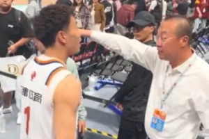 比賽結束后,場邊發生了一個小插曲,上海男籃球員李添榮想和場邊的球迷擊掌互動,但是遭到北京主場工作人員的攔截。