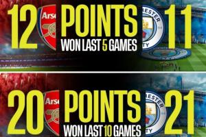 有媒體列出了兩隊近5輪、10輪以及20輪的積分對比,結果阿森納近5輪積分比曼城多1分,近10輪、20輪積分則比曼城少1分。