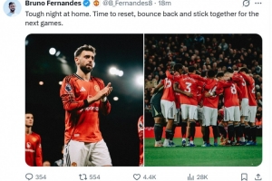 本場(chǎng)比賽B費(fèi)送出精彩助攻幫助卡塞米羅破門,他也在個(gè)人社媒曬出本場(chǎng)照片鼓勵(lì)球隊(duì),寫道:“主場(chǎng)經(jīng)歷一場(chǎng)艱難的失利,現(xiàn)在是時(shí)候進(jìn)行休整,我們會(huì)在下一場(chǎng)比賽團(tuán)結(jié)一致重振旗鼓。”
