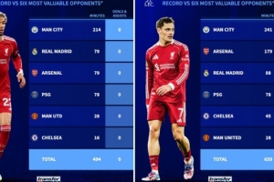德轉(zhuǎn)數(shù)據(jù)統(tǒng)計顯示,本賽季代表利物浦出戰(zhàn)身價最高的6個對手(曼城、皇馬、巴黎、阿森納、曼聯(lián)、切爾西),維爾茨(共計659分鐘)和埃基蒂克(共計494分鐘)僅收獲0球0助攻: