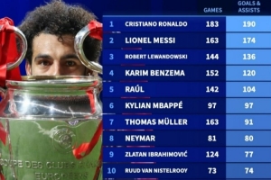 歐冠歷史參與進球榜:梅羅前二,薩拉赫98場71球位列第13位