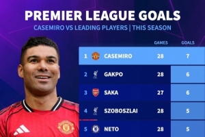 體育資訊3月16日訊 英超第30輪比賽,卡塞米羅破門,曼聯主場3-1擊敗維拉。德國轉會市場統計了卡塞米羅與部分頂級球員本賽季英超的進球數量。