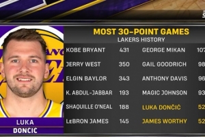 據(jù)統(tǒng)計(jì),東契奇已經(jīng)在湖人52次拿到單場(chǎng)30+,追平名宿沃西,并列隊(duì)史第11位。